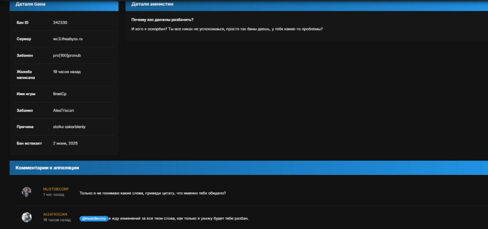 7. Не поделили лес, забанил из-за обиды, пообещал банить по кд, видимо ему позволено все? Так же куча оскорблений, что так же нарушает правила. По какой причине мне отклонили апилку на разбан, с припиской бана "tupoi iwak"?